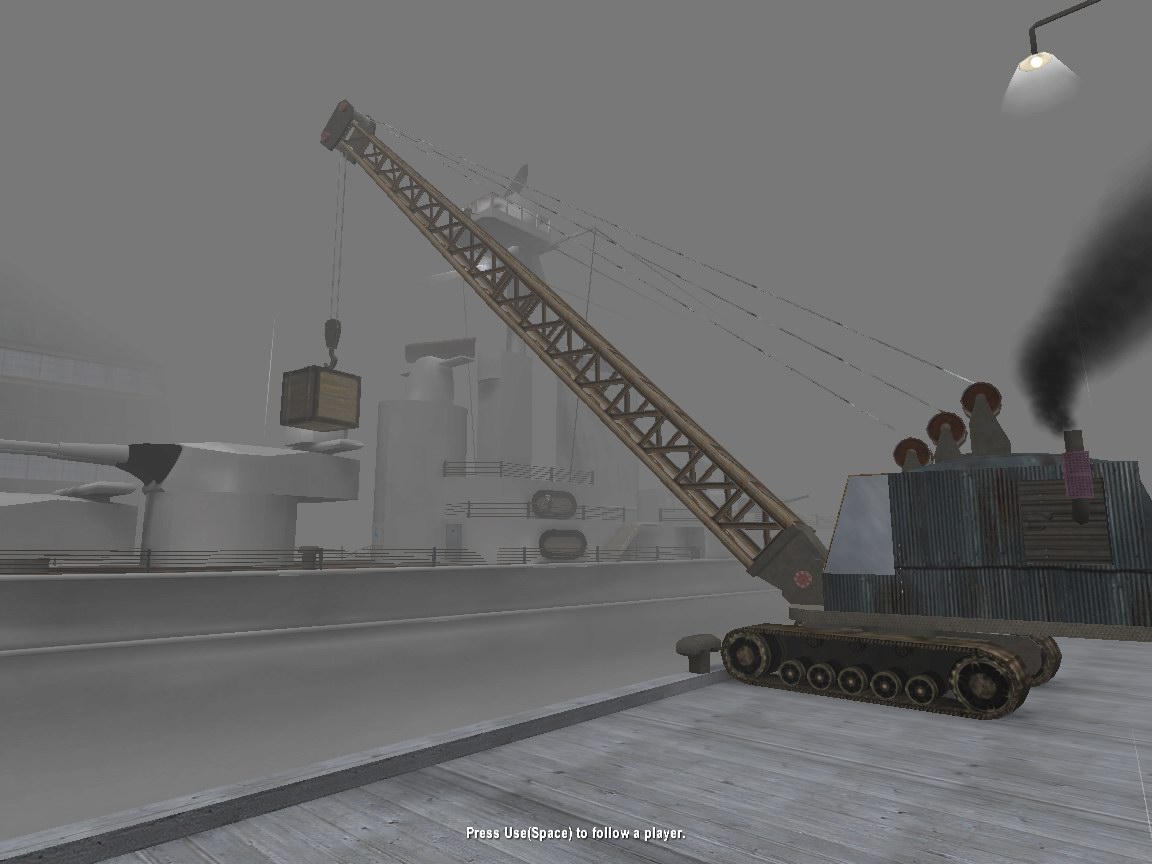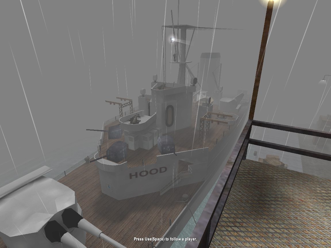 This map is a rather accurate re-creation of the famous war ship Hood. There are 2 maps in the package, one where the ship is at sea, and one where it is docked and undergoing repairs. My review is about the docked version (as it contains more stuff). It is a jv_BOT map and it also features some AI characters normally found only in single player maps.