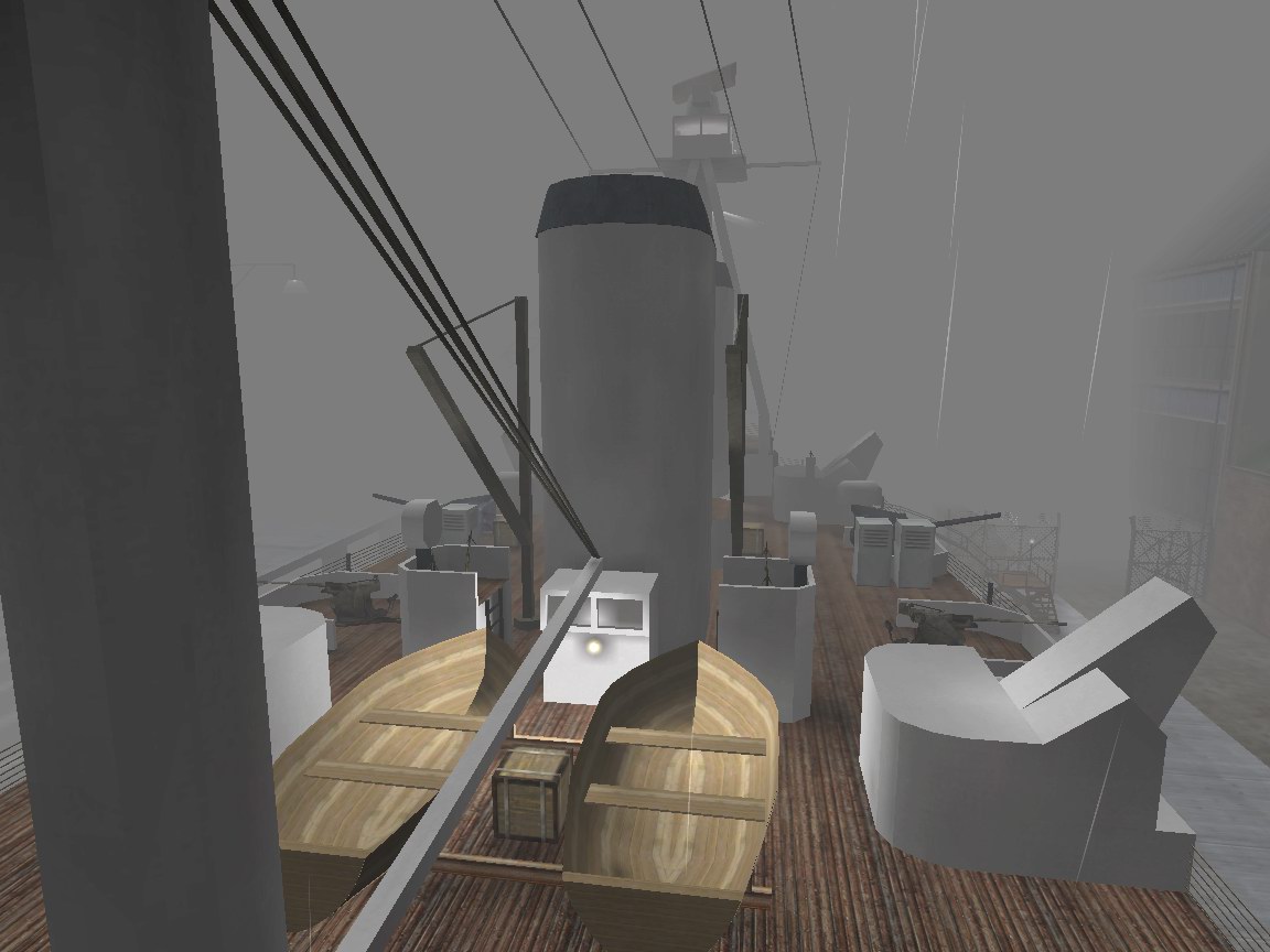 First of all: I have not played this map online, as I coulden't find a server hosting it. I'm getting lag while playing this map locally. The FPS is good, but it feels jeky anyway... I think that the huge amounts of scriped things are to blame. As it is a battleship, I can't really complain that the texturing is bland.