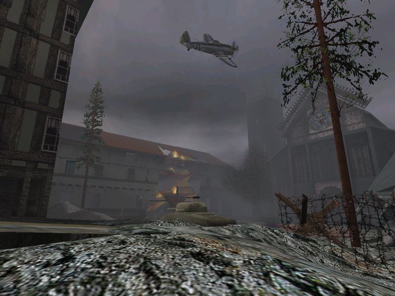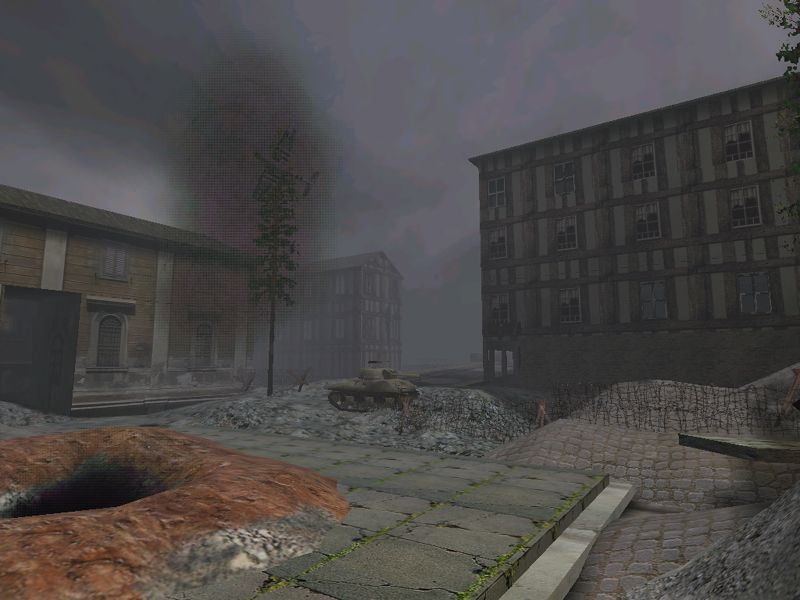 There are several hilarious scenes in this map that qualify for the title 'Game Flaws'. First, a destroyed church tower looks really silly. It's laying on the ground but still intact and completely empty inside. Furthermore, I found a torpedo stuck in a wall, a crashed plane that's not damaged at all, a U-Boot in the river, a balcony that the inhabitans can only reach by breaking a window and a brick wall constructed at the road over the bridge.