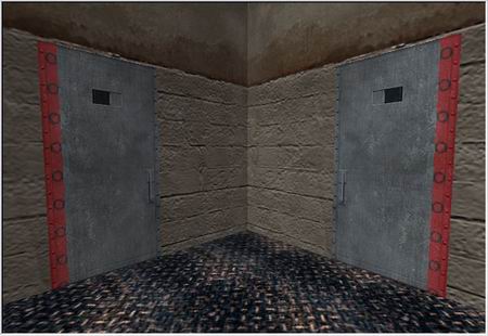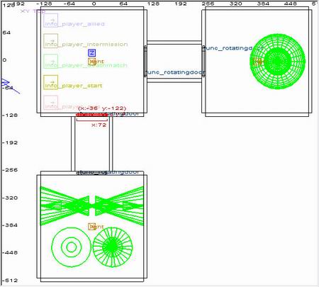 ...the picture above shows three rooms. Two of them contains some complex brushes. One contains the player starting points and nothing more. The rooms are connected with short corridors. At both ends of the corridors, there are doors.