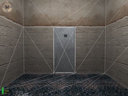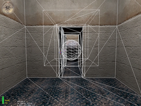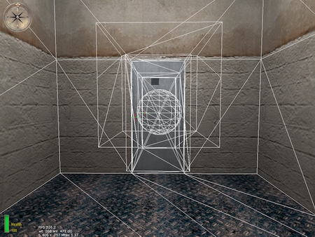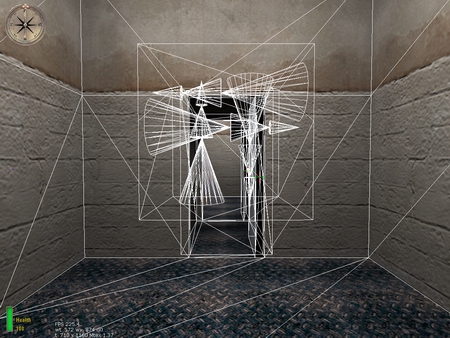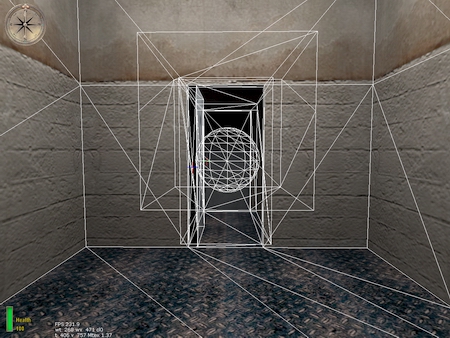 The doors to the room with the sphere has no areaportals, the doors to the room with the twelve cones does contain areaportals. Now lets look at the rooms from the middle room using the r_showtris 2 command ( if you don't know this command, learn about it here ).